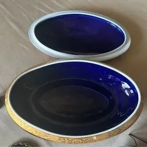 Beautiful vintage Limoges vanity dresser set is in excellent condition. Pictures are part of the listing and show condition. Cobalt blue porcelain with 22k gold trim. Theme is Courting Couples. This is a terrific addition to your collection, and it is priced well below the price for individual pieces. Set includes the following: